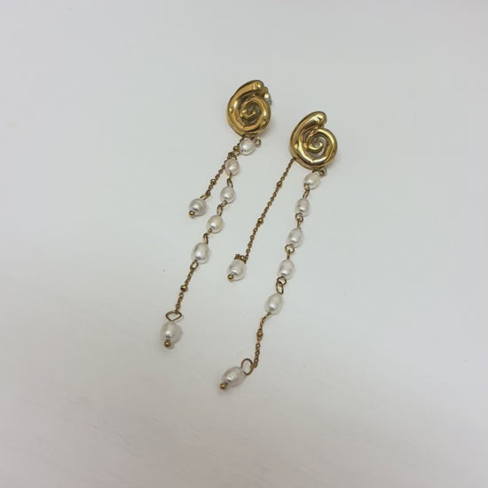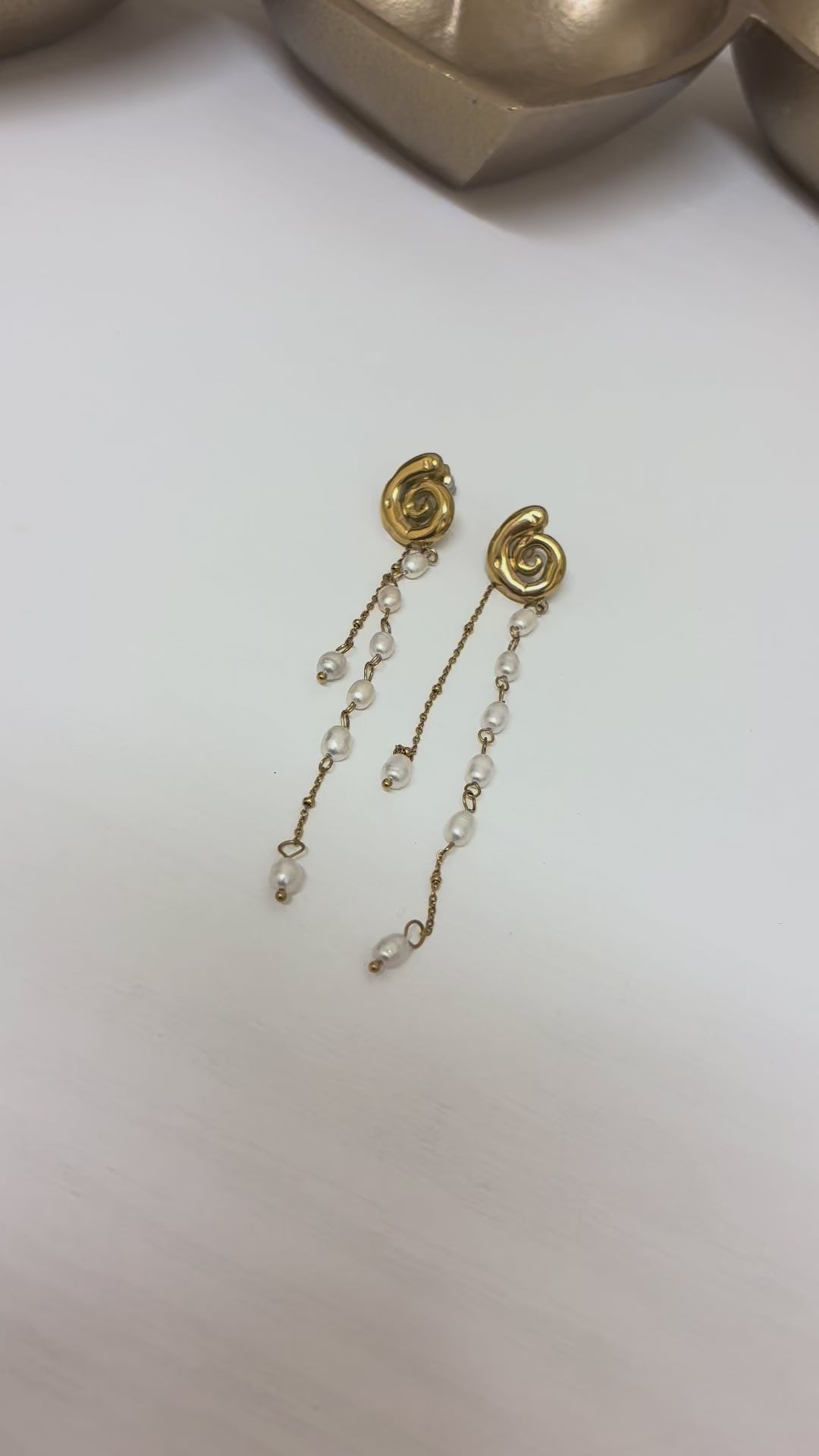 Eleva tu estilo con estos elegantes pendientes largos elaborados en acero inoxidable dorado y decorados con delicadas perlas naturales de agua dulce. Su diseño combina un toque artístico en la parte superior con un detalle de cadenas finas y perlas, creando un movimiento sutil y sofisticado al caminar.