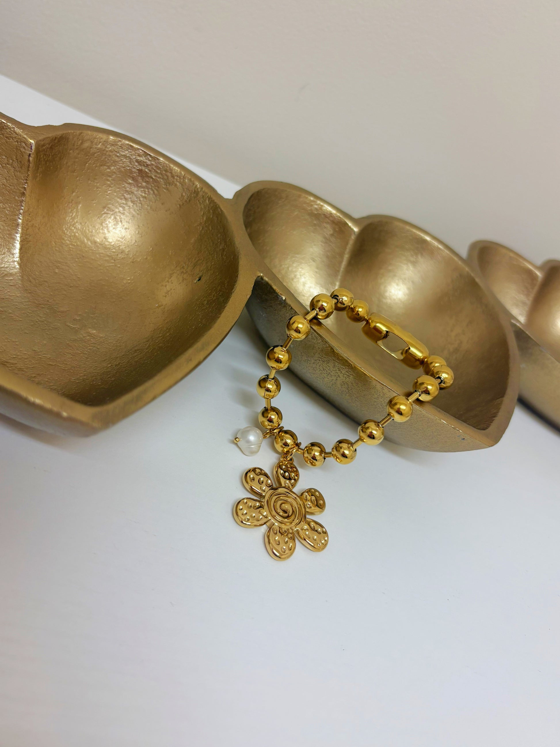 Add a touch of elegance and femininity to your outfit with this beautiful gold beaded bracelet. Made of durable stainless steel, it features a charming flower pendant with engraved details and a delicate pearl accent. Perfect for daily wear or as a thoughtful gift, this bracelet blends timeless beauty with modern style.
