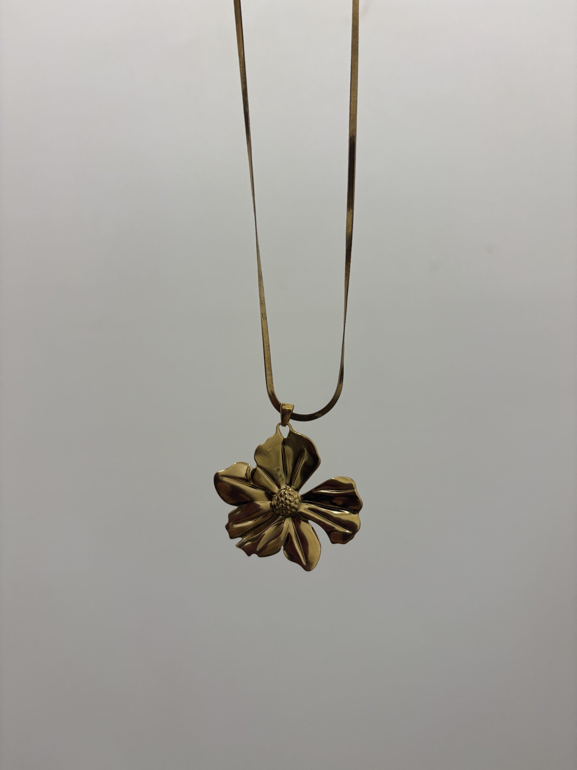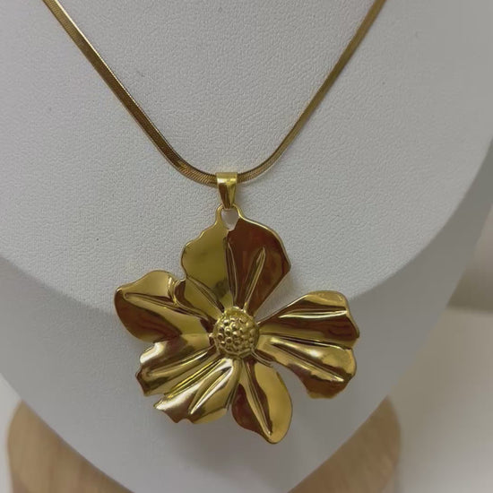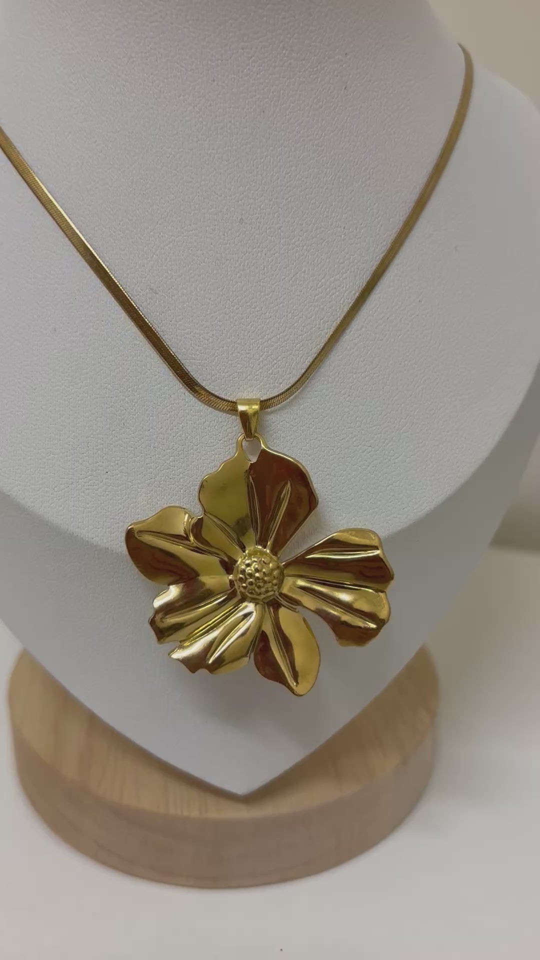 Stand out with this stainless steel necklace featuring a stunning gold flower pendant. Its bold and shiny design makes it perfect for special occasions or elevating your everyday style.