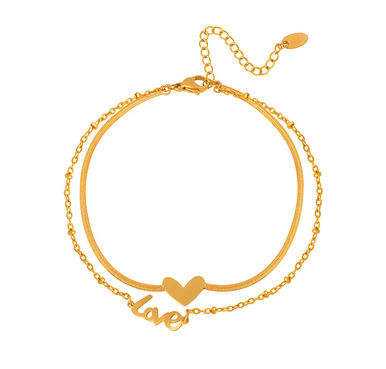 Add a romantic and modern touch to your look with our Double “Love & Heart” Bracelet. Made from high-quality stainless steel with a shiny gold finish, this piece features two layered chains—one with a delicate heart charm and the other with the word love in elegant script. Perfect for wearing alone or stacking with your favorite bracelets.