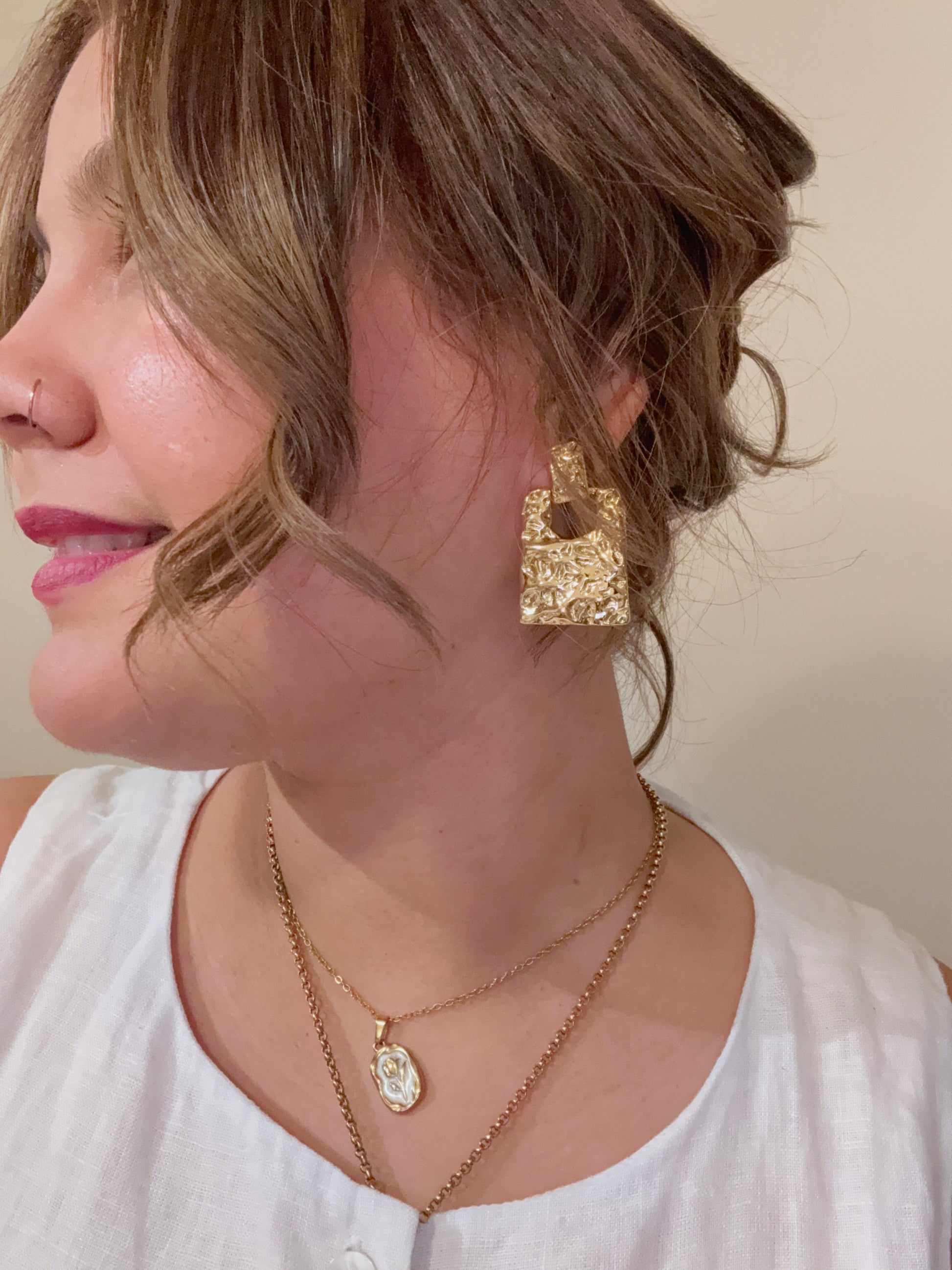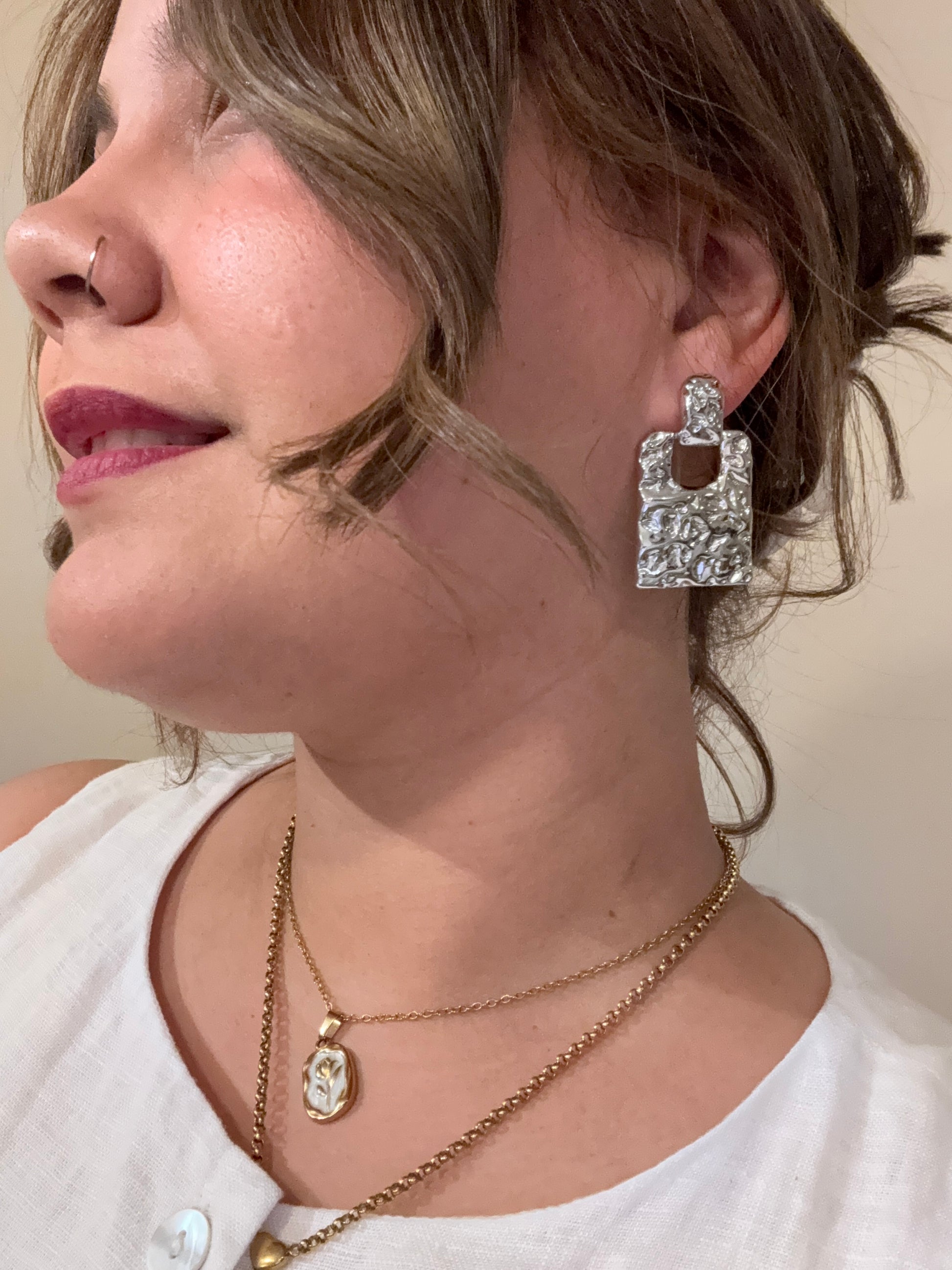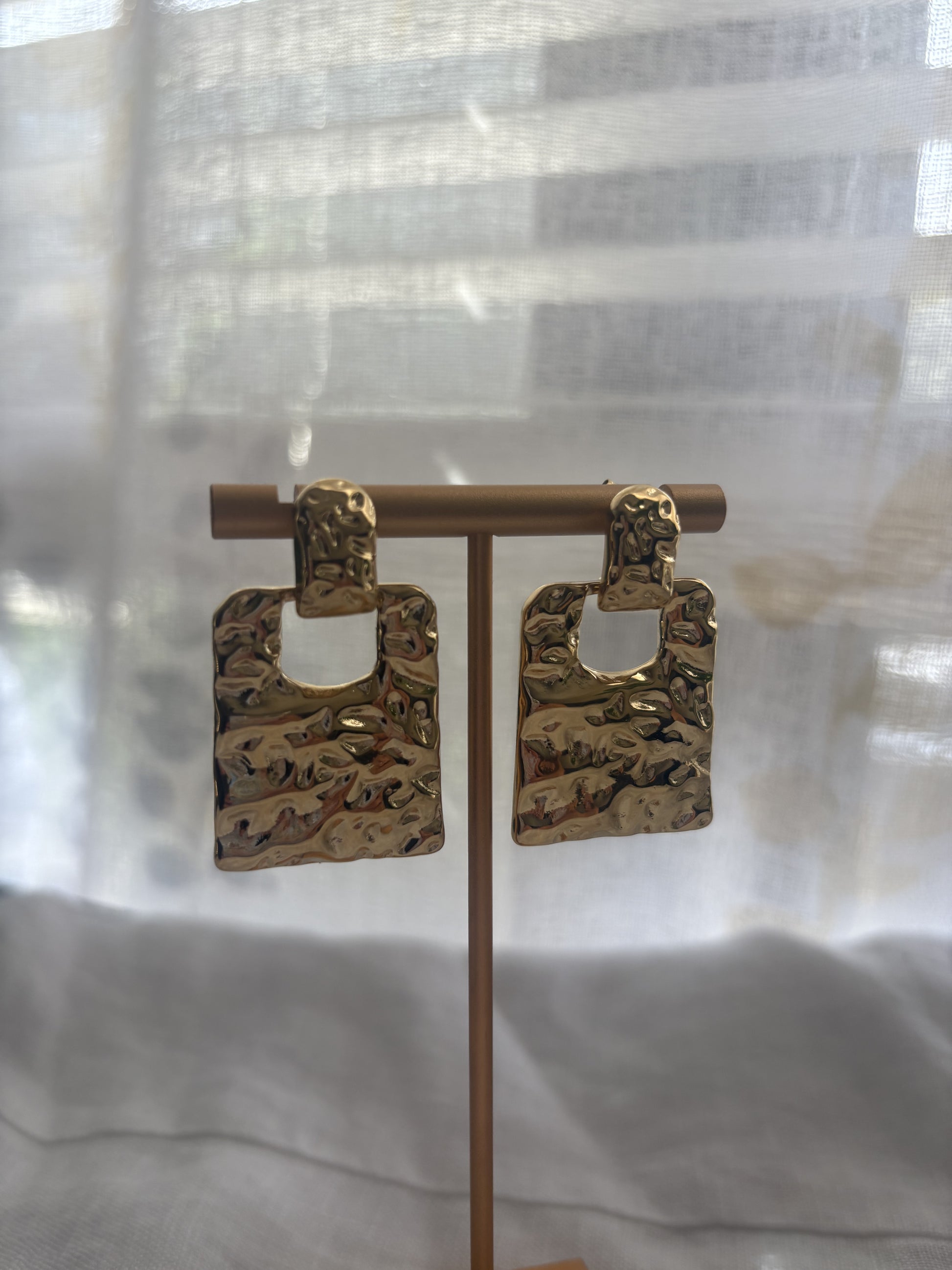 Make a bold statement with these eye-catching hammered gold & silver tone earrings. Designed with a modern square silhouette and rich texture, they add a touch of glam to any outfit—from casual to chic.